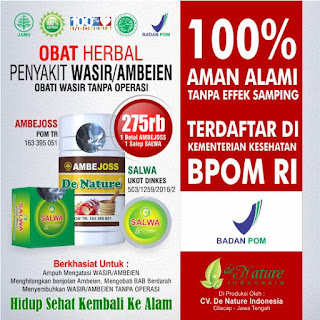 Cara mengobati Ambeyen dengan obat herbal - Kapsul Ambejoss Dan Salep Salwa adalah Paket Pengobatan herbal alami yang sangat ampuh untuk menyembuhkan penyakit wasir ambeien dengan cepat aman tanpa efek samping dan tanpa harus melakukan operasi.
