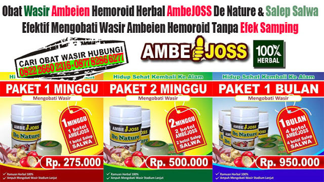 Dengan Kapsul Ambejoss dan Salep Salwa vmerupakan paket Denature yang ampuh dan manjur mengobati dan menyembuhkan penyakit wasir aman dan tanpa menimbulkan efek samping karena 100% berbahan herbal alami pilihan, jadi anda tak perlu khawatir karena alhamdulillah sudah banyak pasien kami yang telah sembuh dengan obat herbal kami ini. Konsultasi dan Informasi selengkapnya hubungi : 0822 2660 2316 - 0877 8286 6277